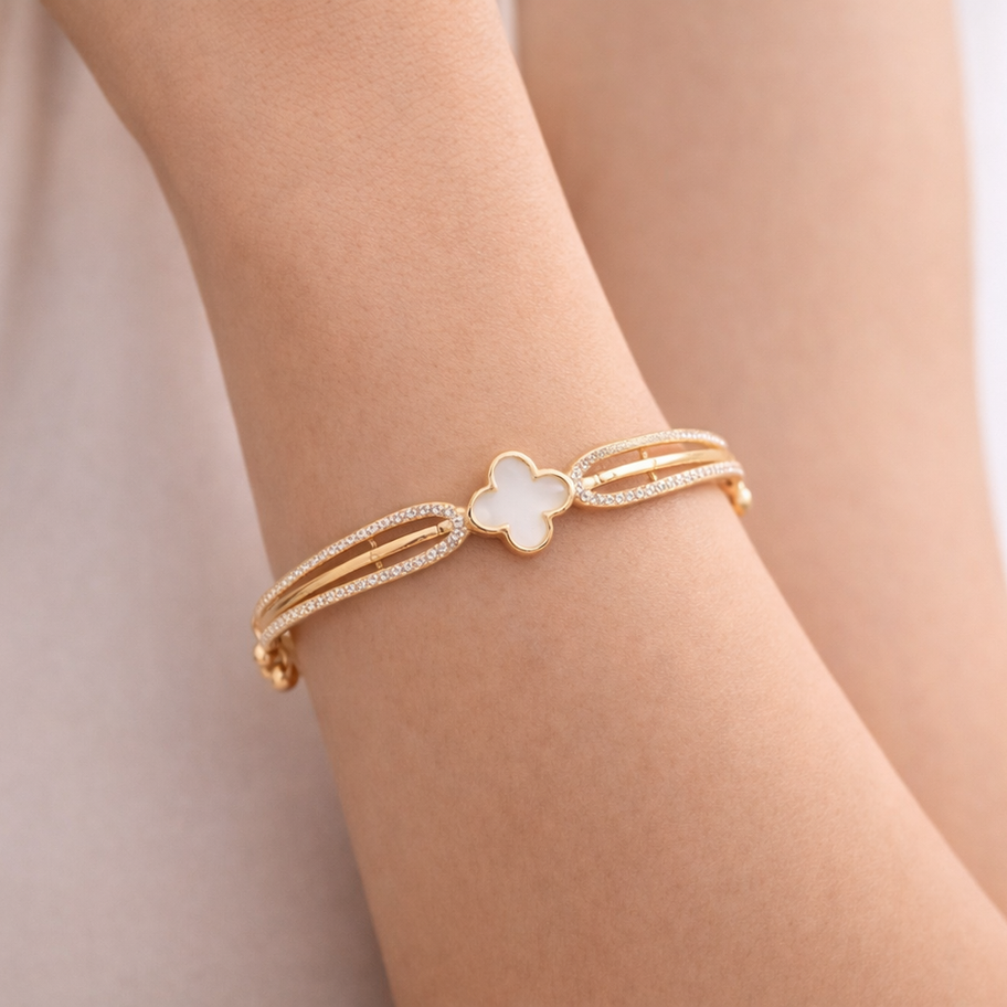 A beautifully crafted 18K gold Kada, designed to symbolize strength and elegance. The "Aarav" kada features intricate patterns and a smooth finish, making it perfect for both everyday wear and special occasions. Accompanied by a lucky charm that adds a personal touch to this classic piece, it's a timeless accessory for those who appreciate sophistication and good fortune. BIS HUID Hallmarked for authenticity and purity.